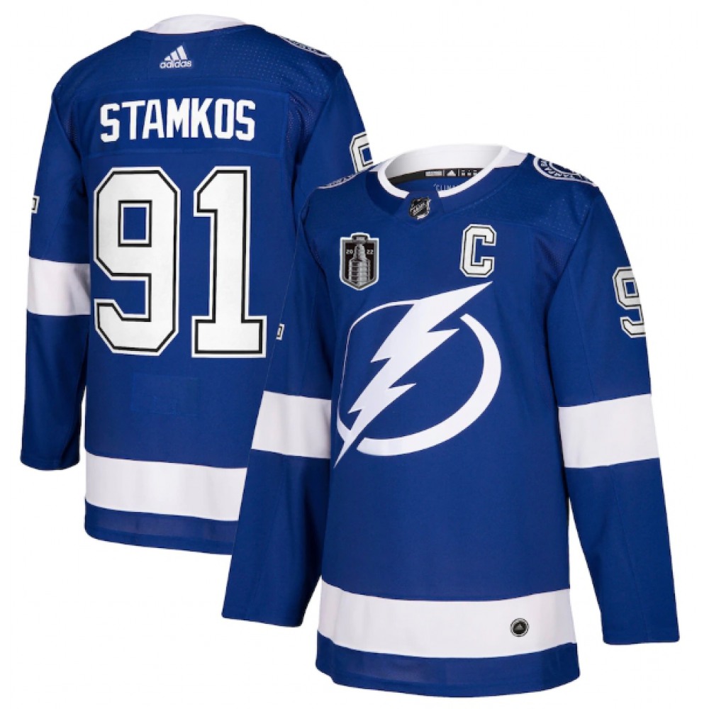 Men's Tampa Bay Lightning #91 Steven Stamkos 2022 Blue Stanley Cup Final Patch Stitched Jersey