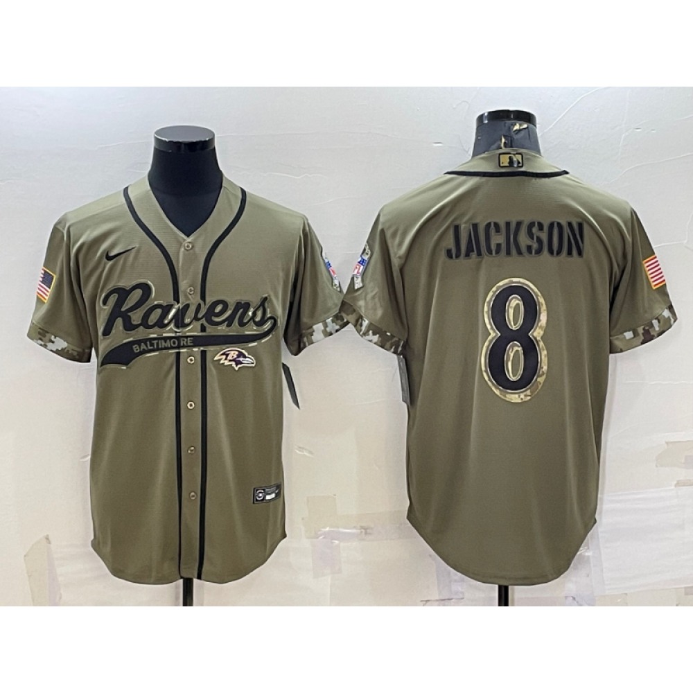 Men's Baltimore Ravens #8 Lamar Jackson Olive 2022 Salute to Service Cool Base Stitched Baseball Jersey