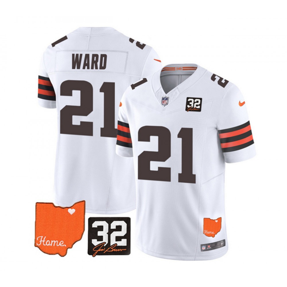 Men's Cleveland Browns #21 Denzel Ward White 2023 F.U.S.E. With Jim Brown Memorial Patch Vapor Untouchable Limited Stitched Jersey