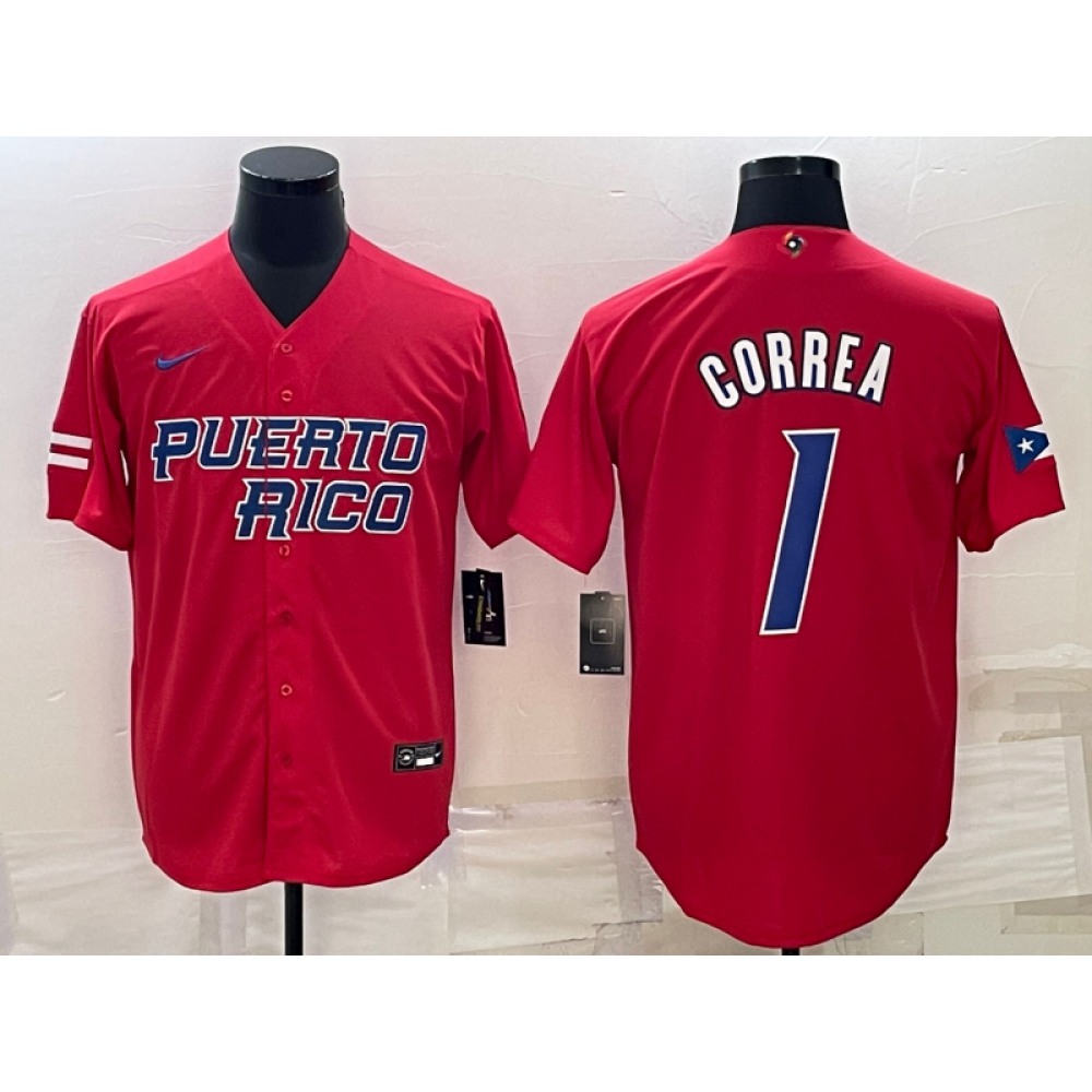 Men's Puerto Rico Baseball #1 Carlos Correa 2023 Red World Baseball Classic Stitched Jersey