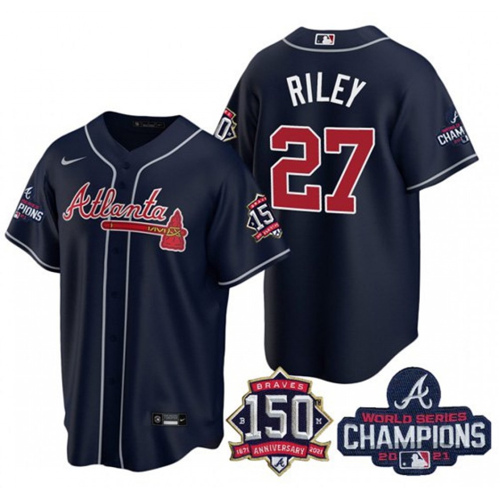 Men's Atlanta Braves #27 Austin Riley 2021 Navy World Series Champions With 150th Anniversary Patch Cool Base Stitched Jersey